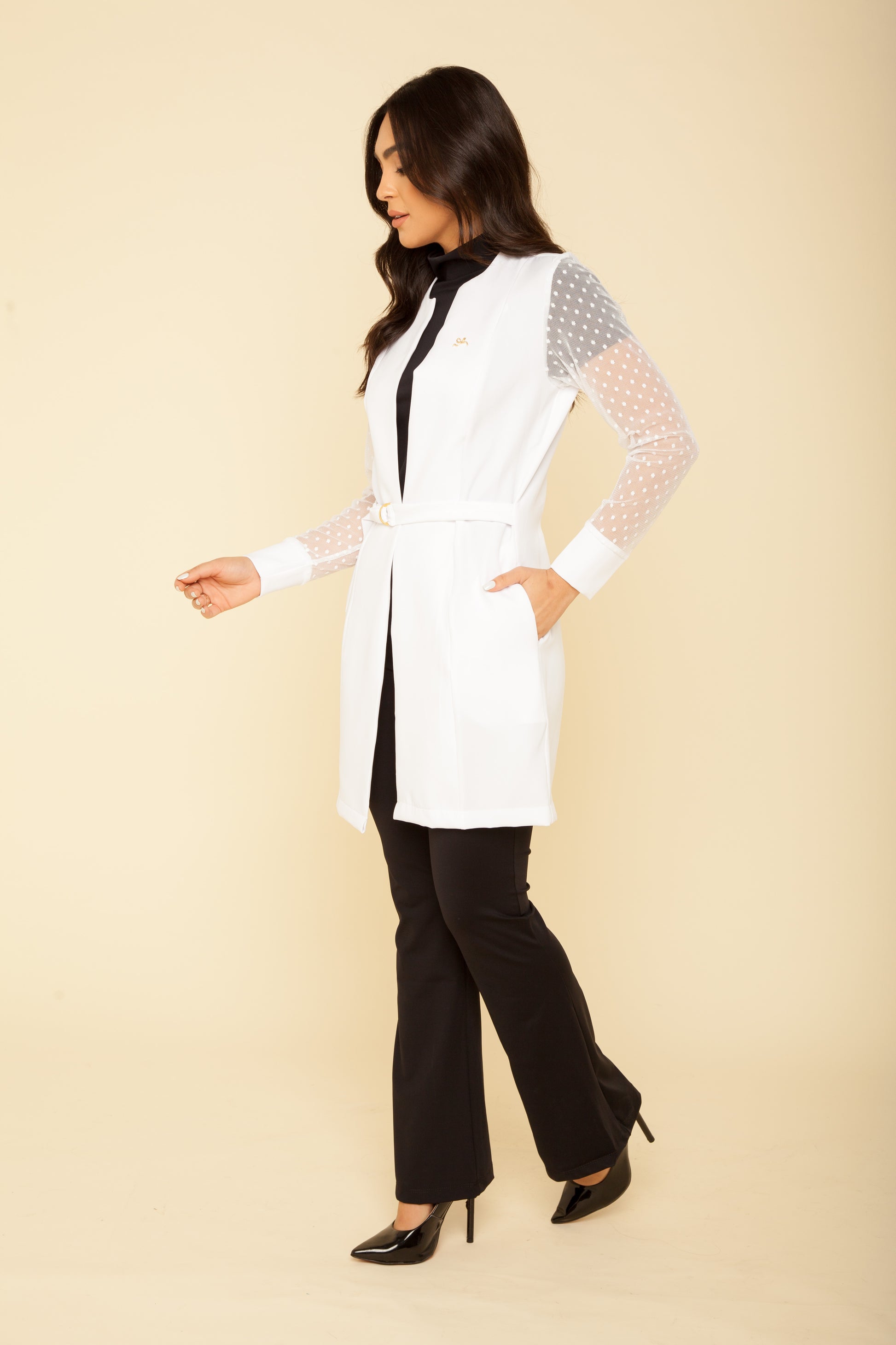 Tailored women's lab coat featuring mesh sleeves and functional side pockets.